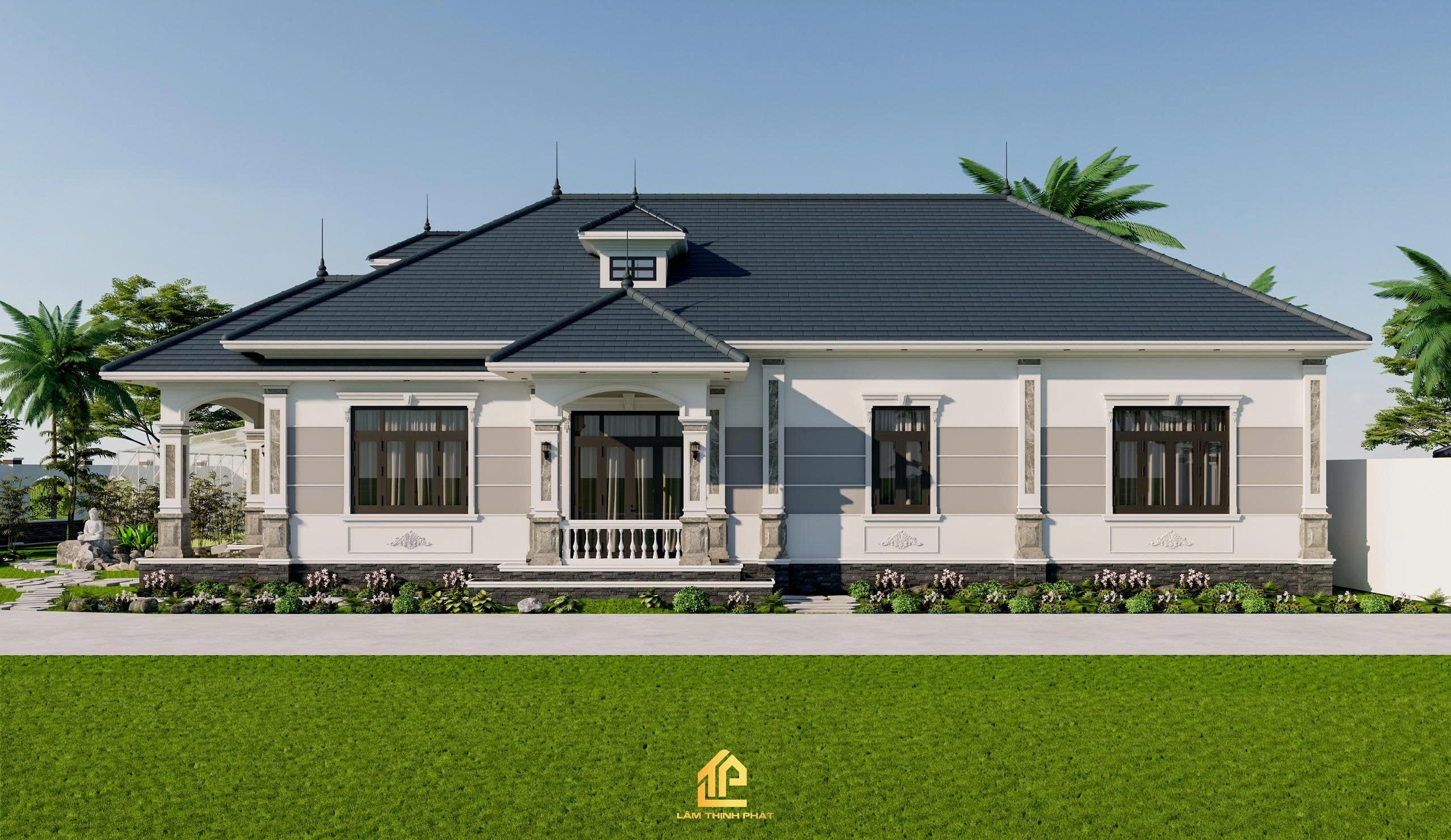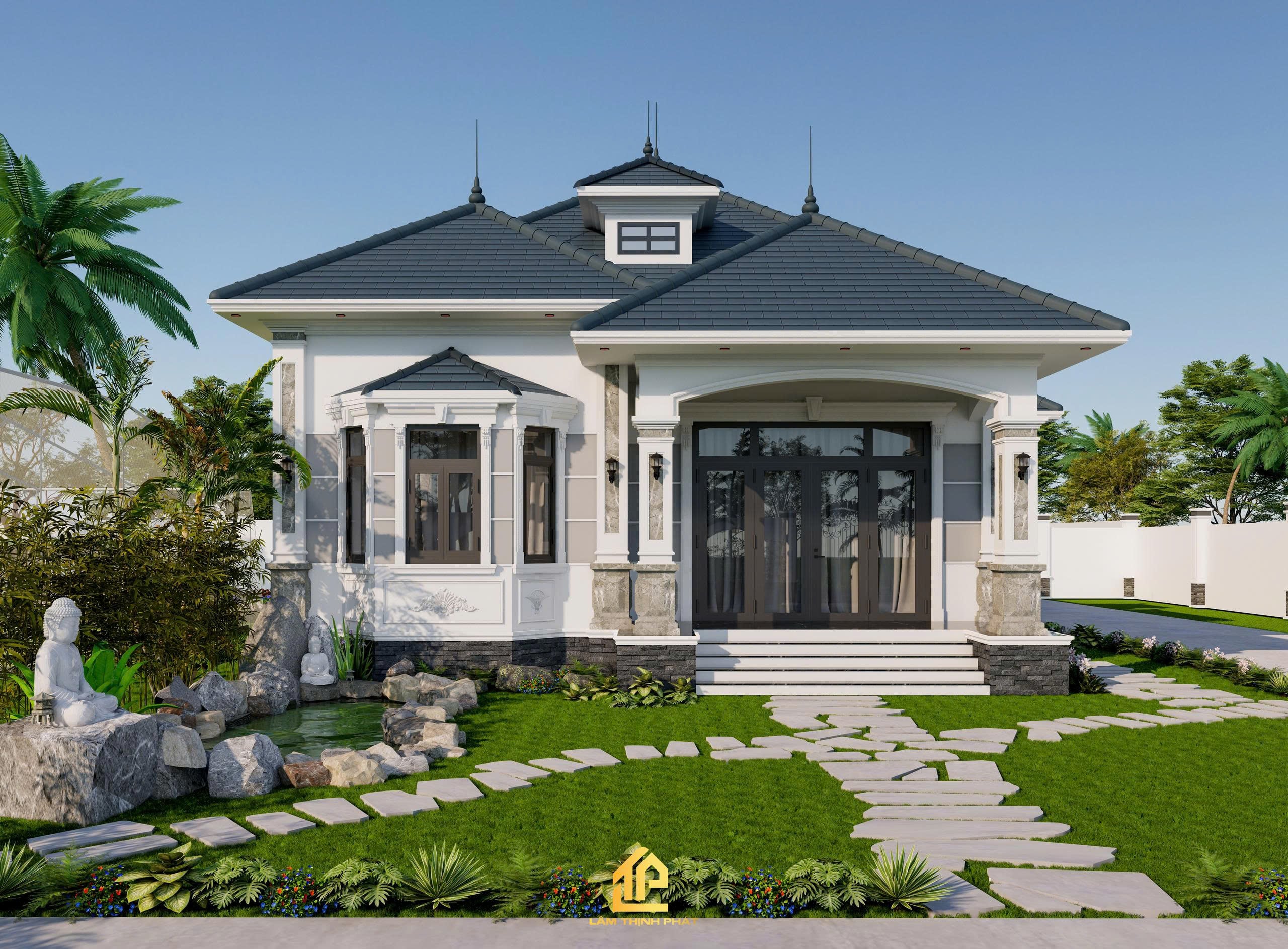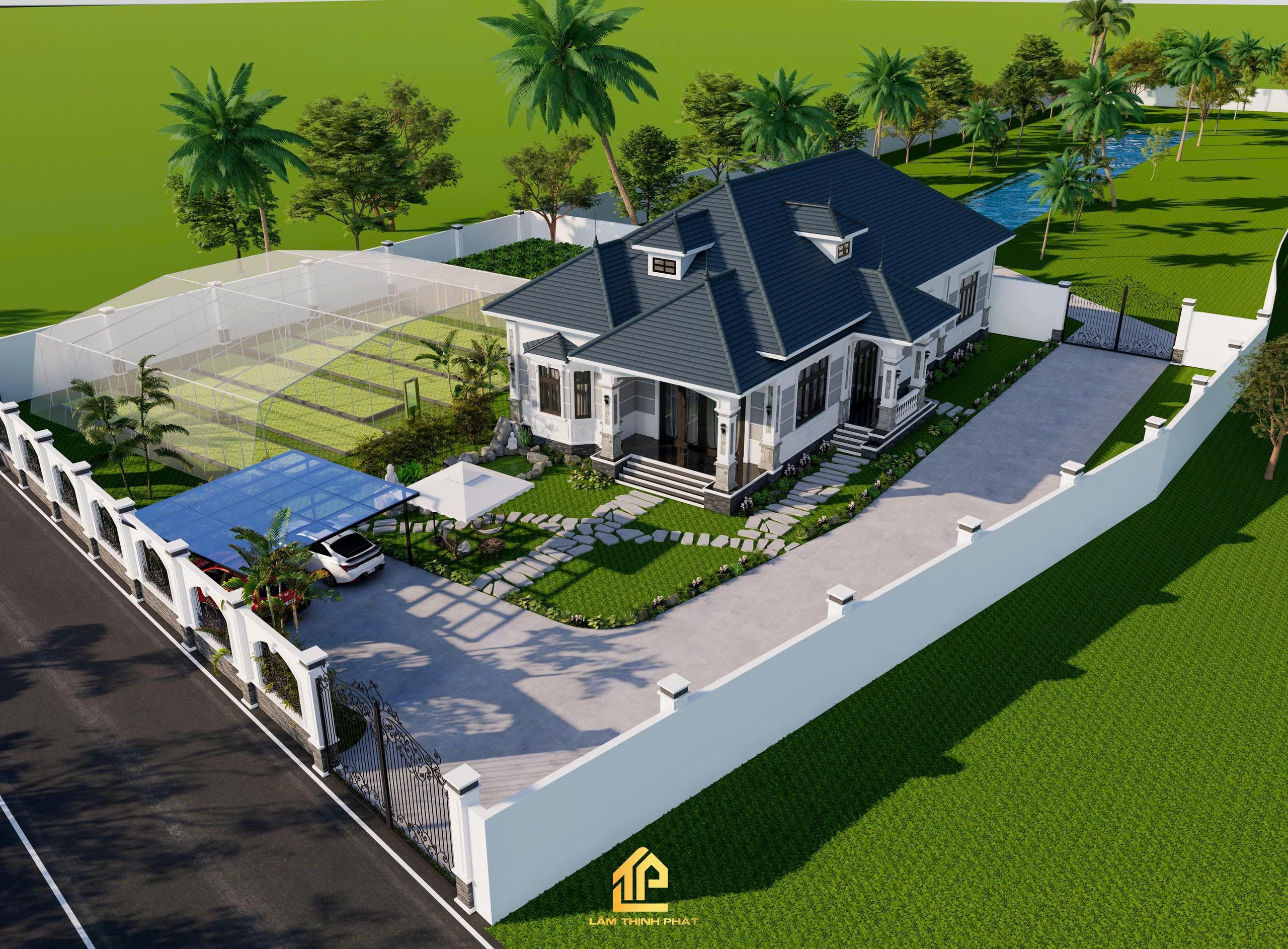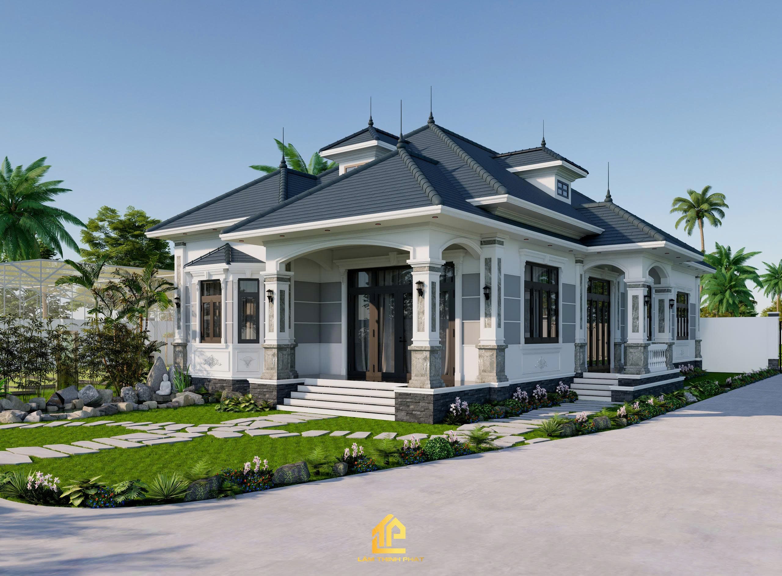 Khuôn viên rộng rãi với hệ thống cây xanh, lối đi đá uốn lượn và bãi cỏ mướt mắt giúp gia chủ tận hưởng trọn vẹn sự thư thái mỗi ngày.