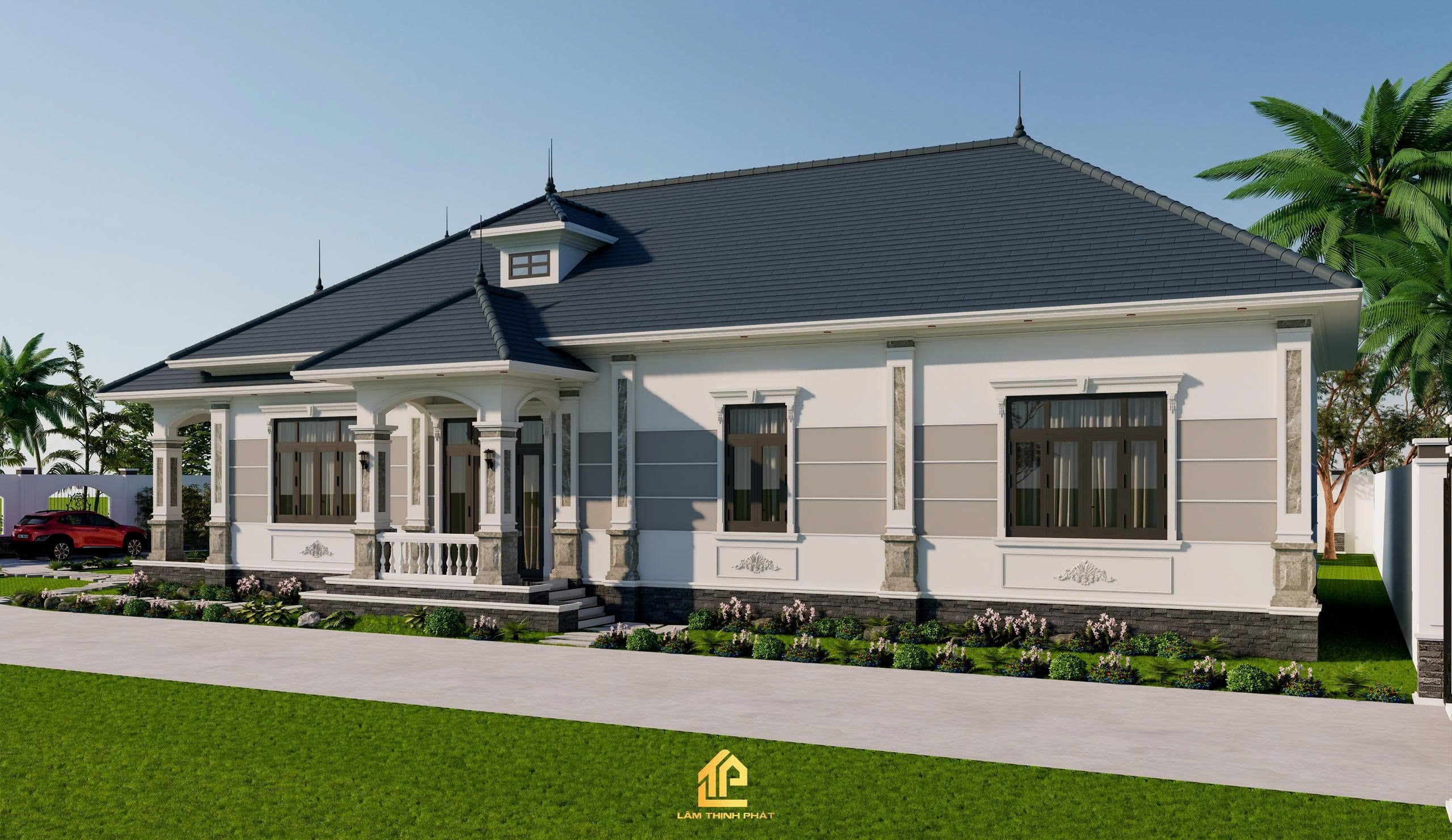 Biệt thự được xây dựng theo phong cách tân cổ điển sang trọng, mái ngói xanh đặc trưng tạo nên vẻ đẹp bề thế nhưng vẫn mềm mại, hài hòa. Từng đường nét từ hệ cột, cửa sổ lớn đến màu sắc ngoại thất đều được chăm chút, mang đến cảm giác đẳng cấp và tinh tế.