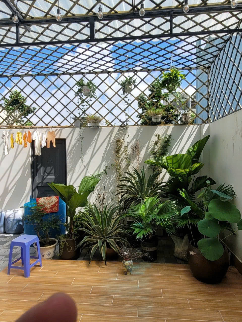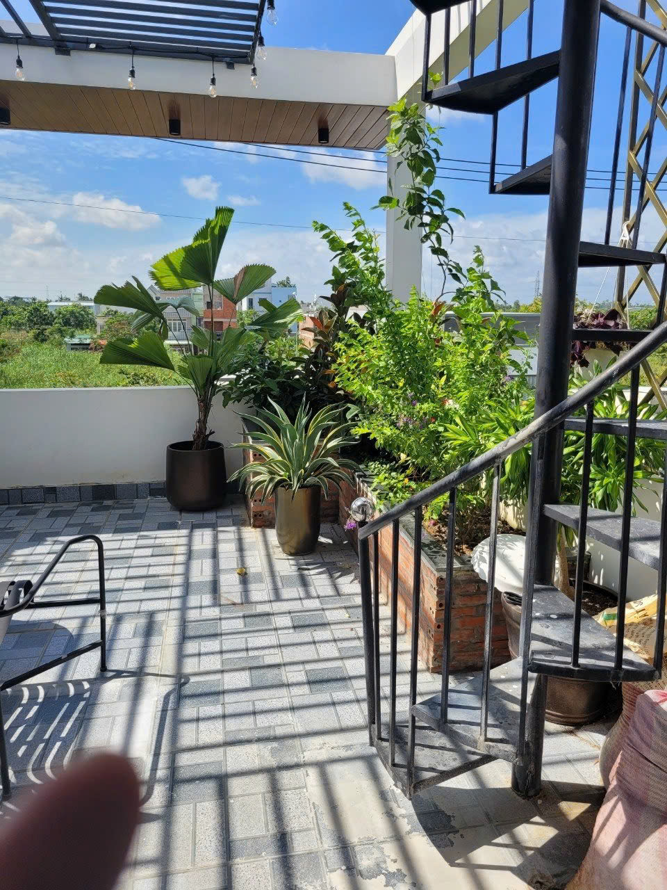 Điểm đặc biệt của công trình là khu sân thượng rộng rãi, được bố trí như một khu vườn nhỏ với nhiều loại cây xanh, tạo không gian thư giãn lý tưởng cho gia đình. Cầu thang xoắn dẫn lên rooftop trở thành chi tiết vừa thẩm mỹ vừa tiện dụng, gắn kết hài hòa giữa kiến trúc và cảnh quan.
